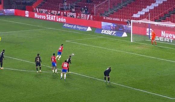 47'巴萨进攻受阻,蒙托罗起大脚直接发动反击,索尔达多单刀破门,格拉纳达2-0巴萨!